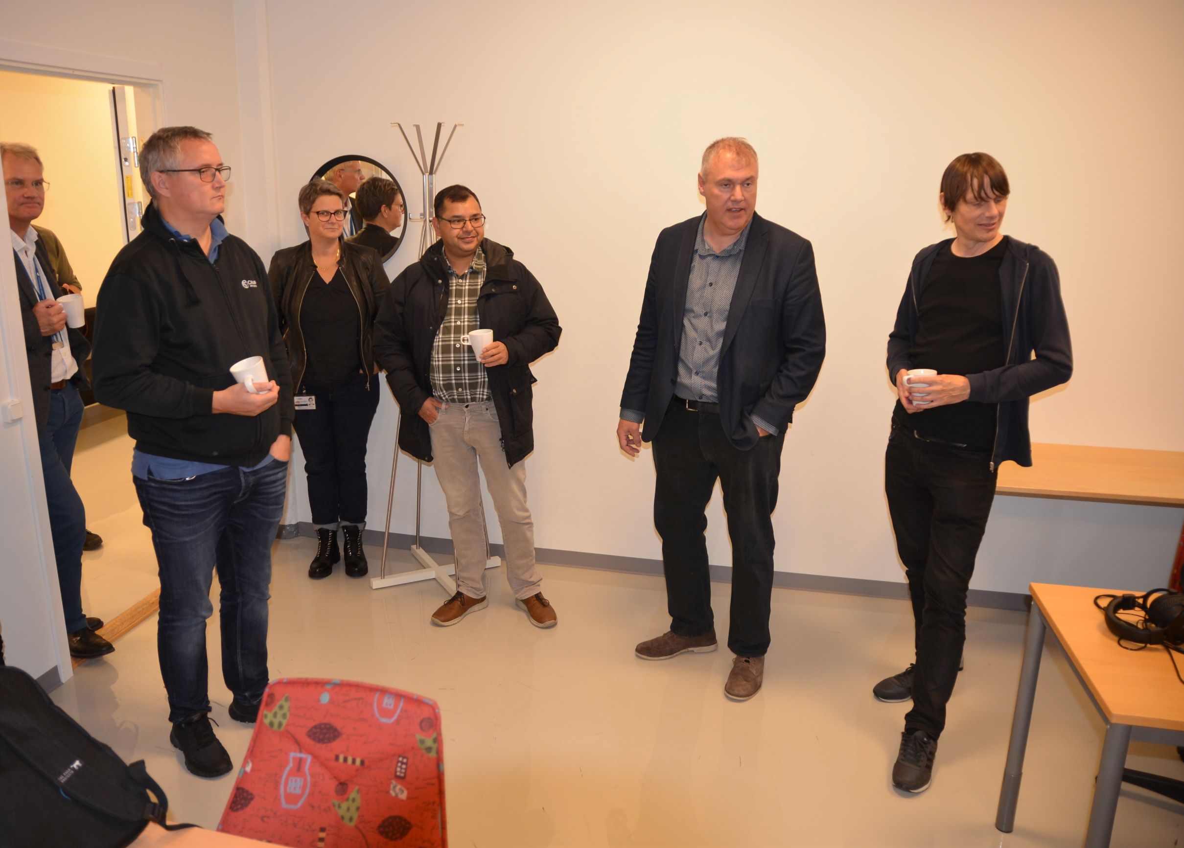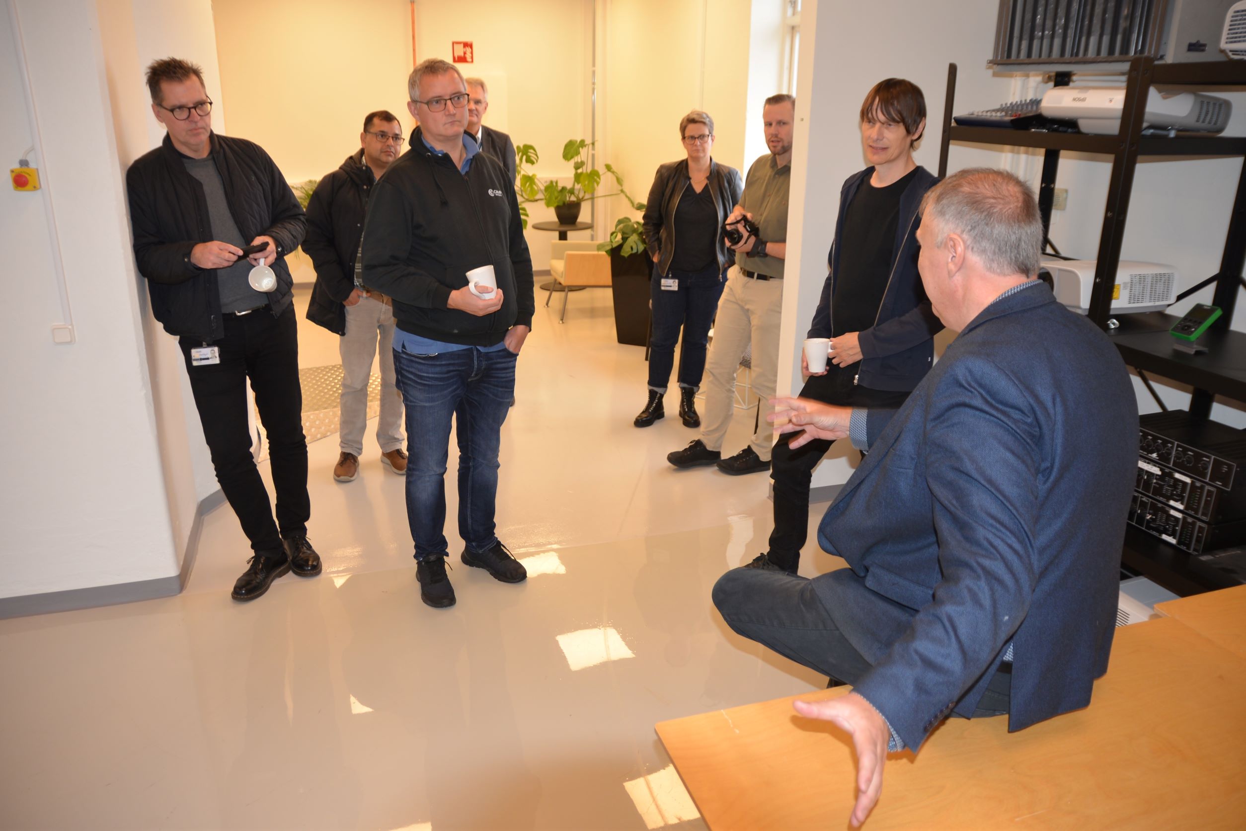 Anders Rickman (stående till vänster), verksamhetschef för Yrkeshögskolan Jönköping, visade runt i deras nya lokaler på Rosenlund.