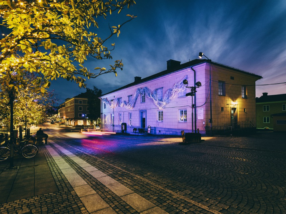 Telegrafhuset i Alingsås är bara en av de platser som valts för en fantastisk ljusinstallation. Detta gjordes av studenter som arbetade med den professionella ljusdesigneren Nikoletta Theodoridi. Foto: Patrik Gunnar Helin