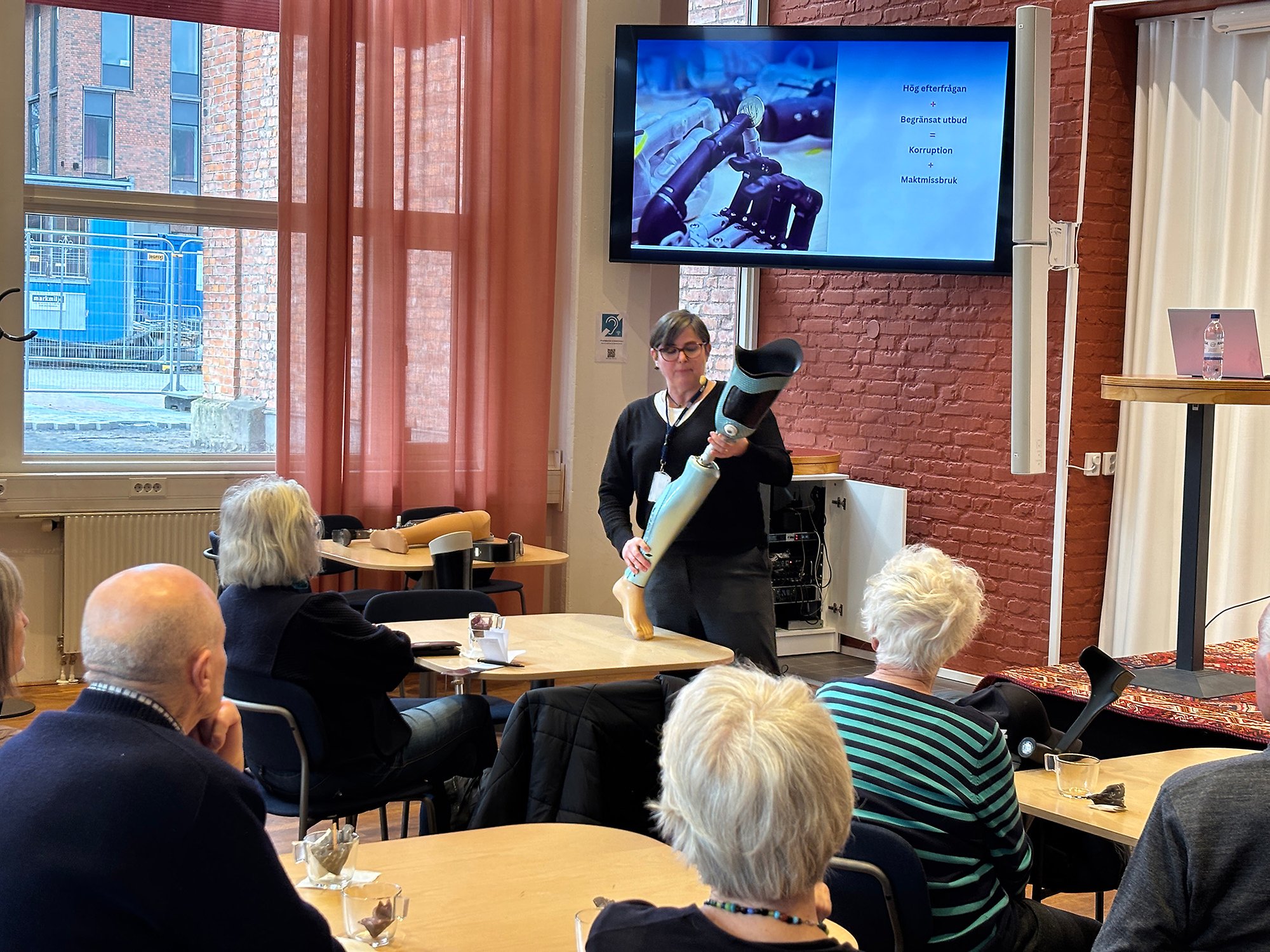 Under föreläsningen visade Nerrolyn även upp olika proteser och berättade om de höga kostnaderna. I kombination med bristen på utbildad personal har detta öppnat för oseriösa aktörer som utnyttjar situationen.
